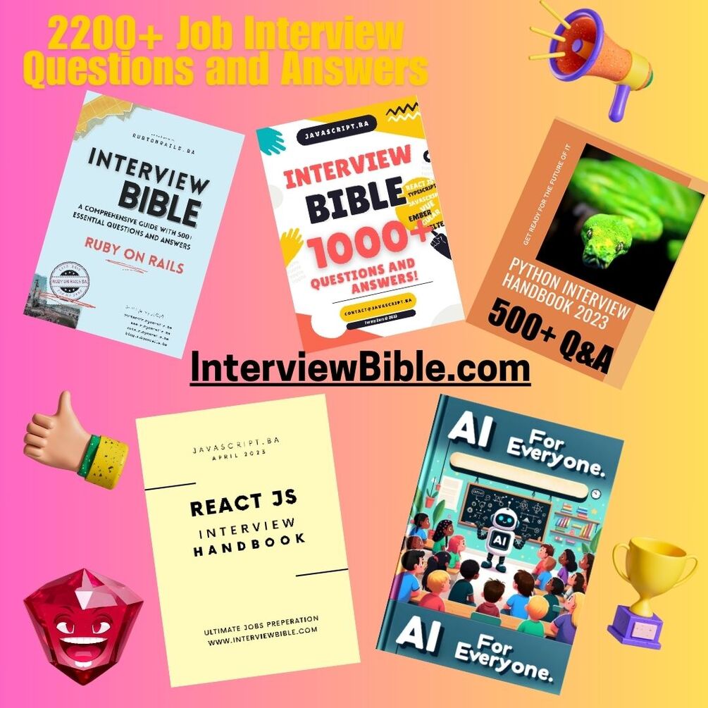 Ruby On Rails Interview bible book with 500+ Questions and Answers, also JavaScript Bible with 1000+ Questions and Answers, Python Handbook with 500+ Questions and Answers and also free samples of Python handbook 112+ Questions and Answers, and ReactJS with 112 Questions and Answers!